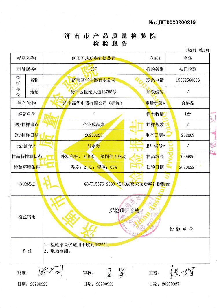 濟(jì)南高華電器有限公司 > 榮譽(yù)資質(zhì) > 低壓無功功率補(bǔ)償裝置GGJ檢測報告