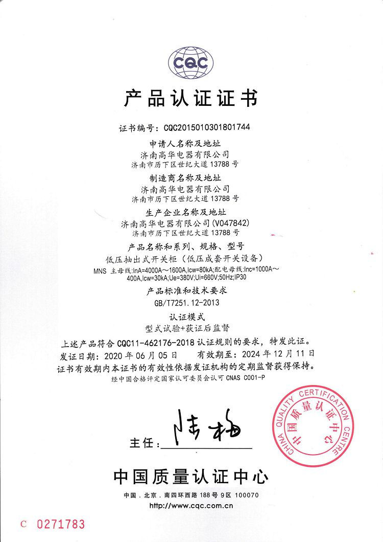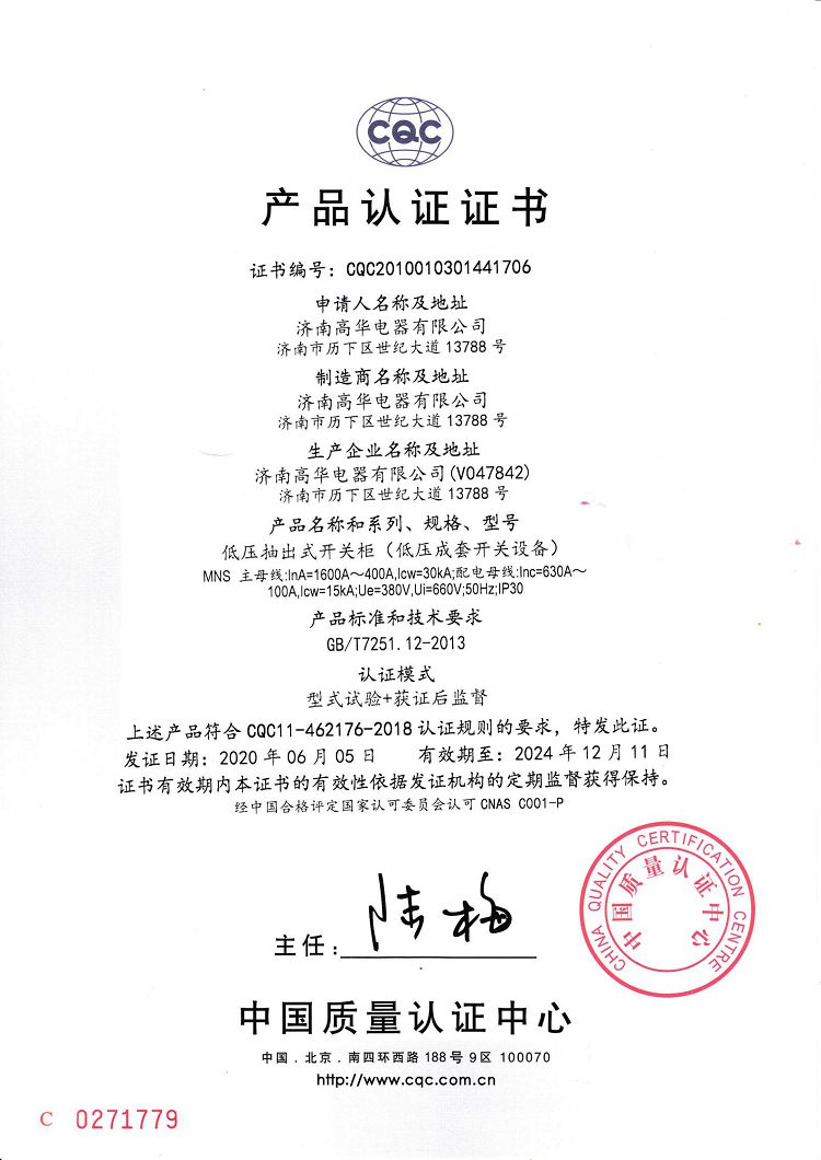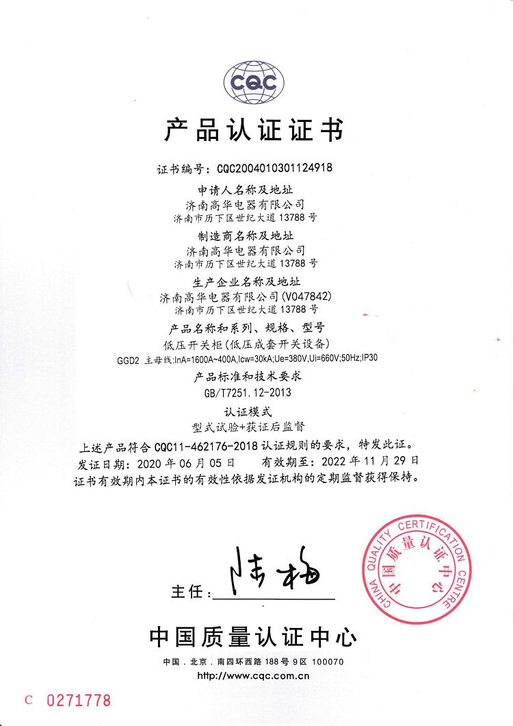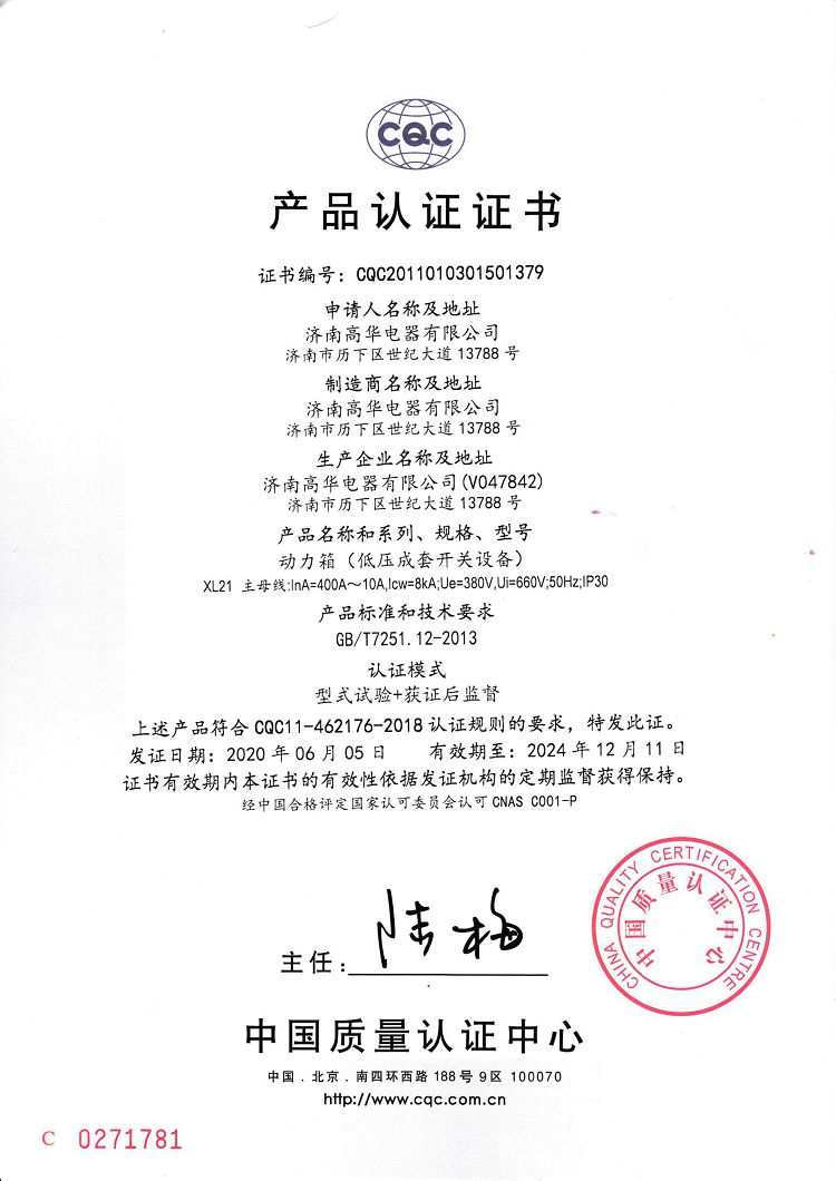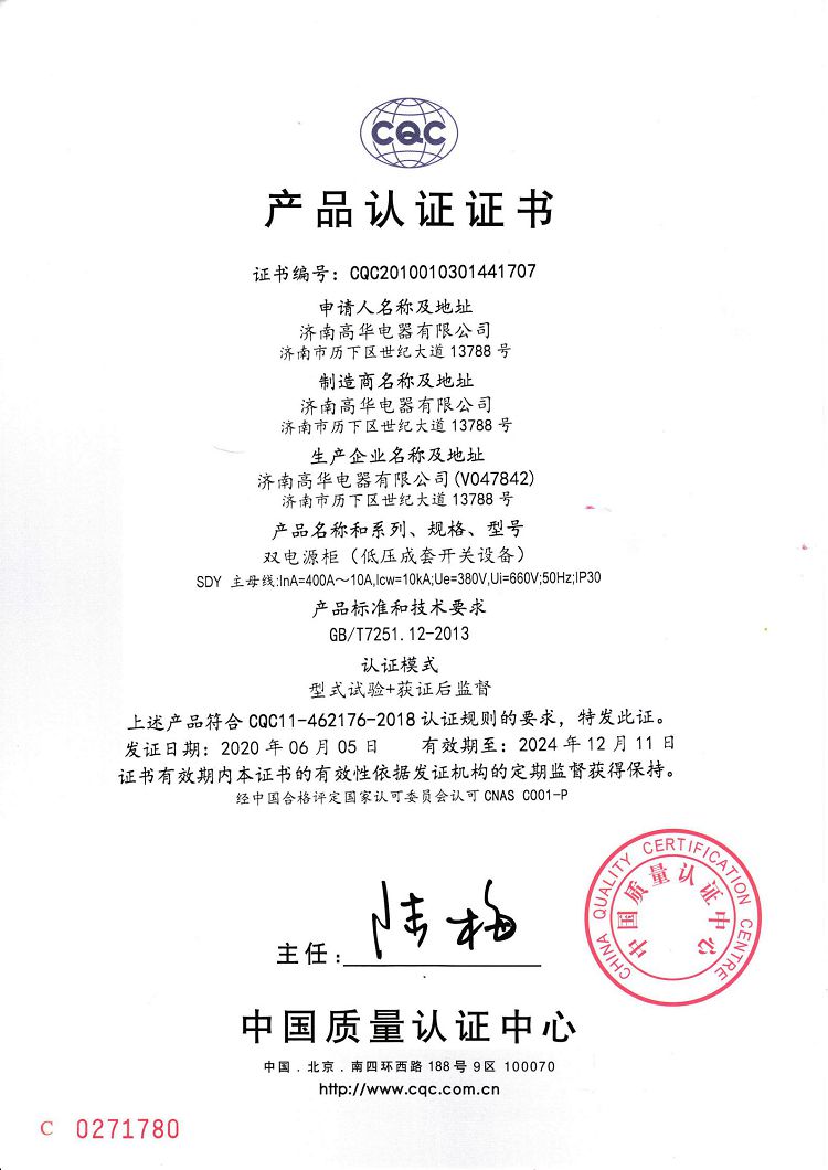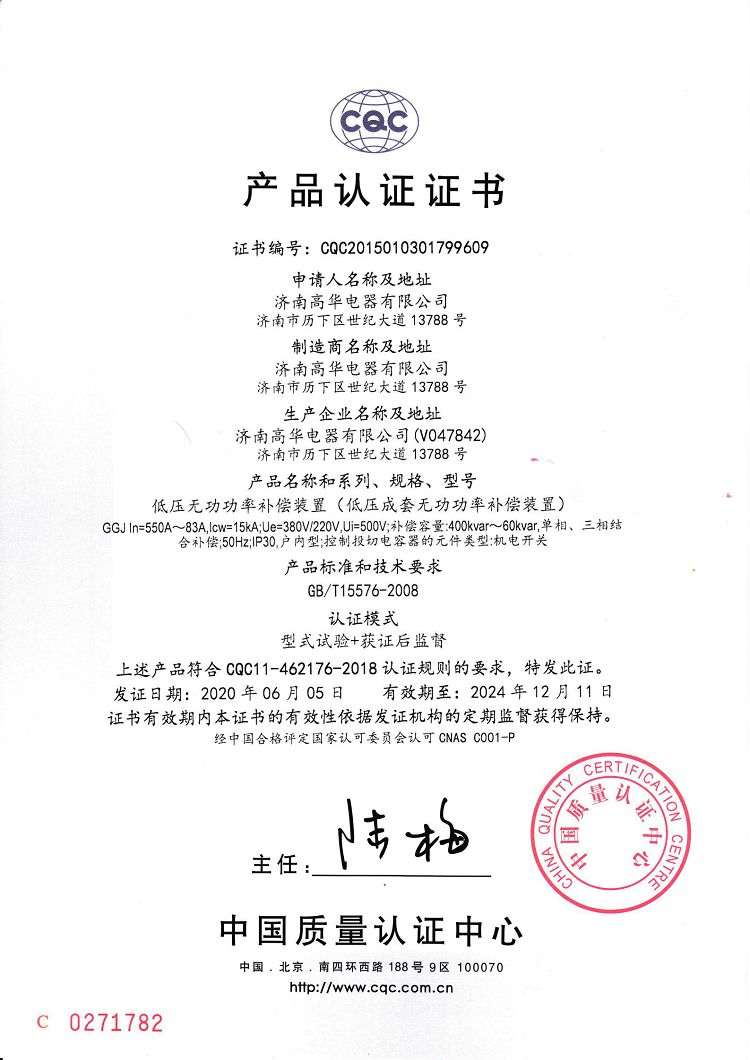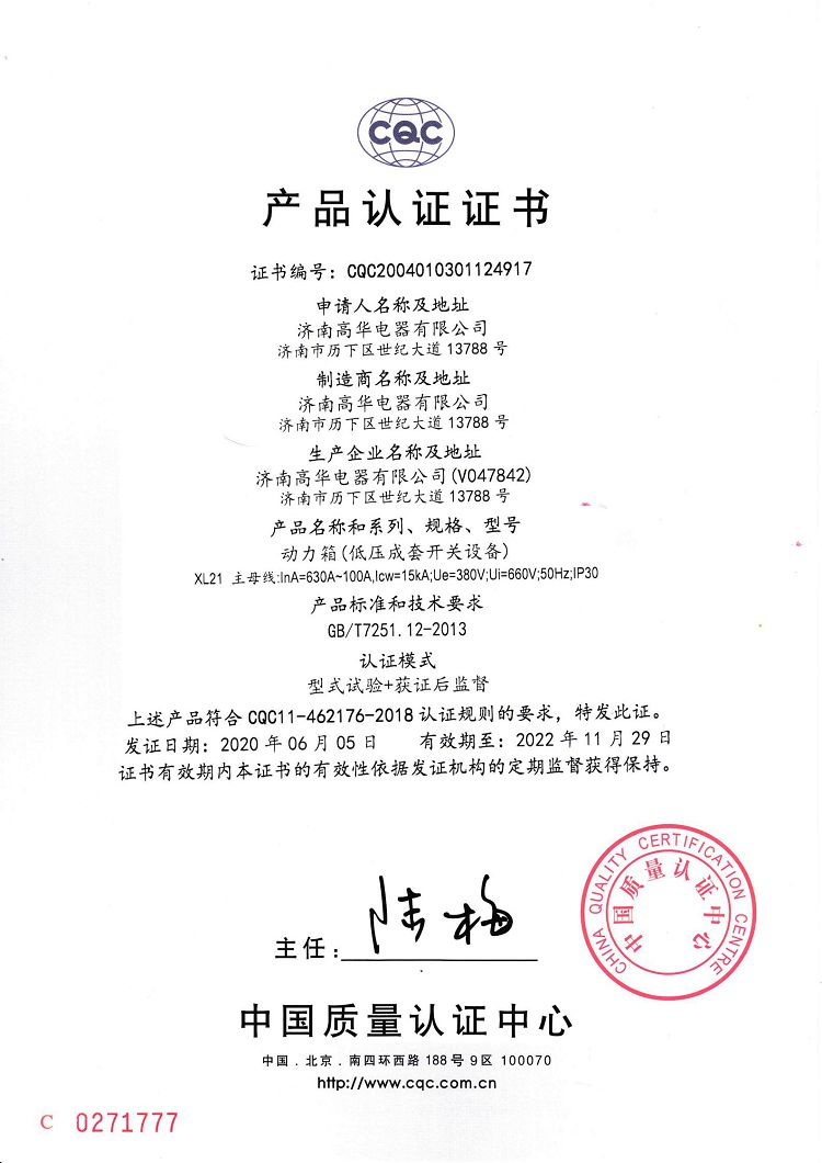 濟南高華電器有限公司 > 榮譽資質 > 2020CQC產品認證證書
